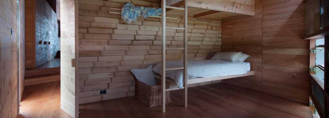 Jury's Comment: The Shearers Quarters is located on an historic farming property on North Bruny Island, on land first granted to Captain James Kelly in 1840. The building sits as a companion building to the historic cottage constructed by Kelly and provides accommodation for the shearers and rural contractors. Making use of local and recycled timbers the building design forms a holistic story between the artist, home and setting. This project displays the notion that timber is a vehicle for telling stories about places, as a great canvas for those who inhabit the building. The adaptive use of materials is impressive and the timber usage is creative in design with its unusual panel size and offset joints adding texture throughout. The wooden bookcase in the living space is a standout feature.