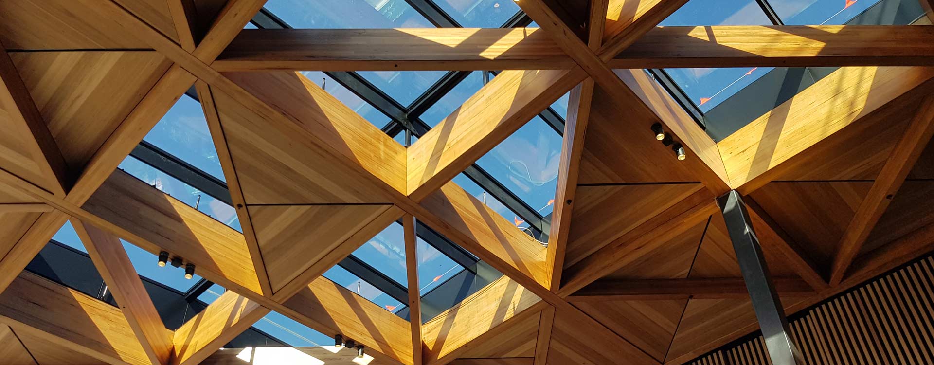 Intergrain Trade & Industrial National Specification Manager, Gareth Connell, worked with the project's mass timber manufacturers, Australian Sustainable Hardwoods (ASH), to help realise this distinctive feature of redevelopment for Scentre Group (owners of Westfield Knox).