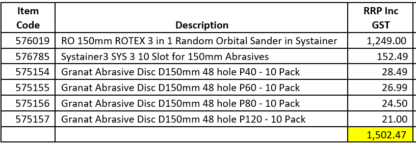 4 x Festool branded packs valued at $1,500. The Festool branded pack includes the following: